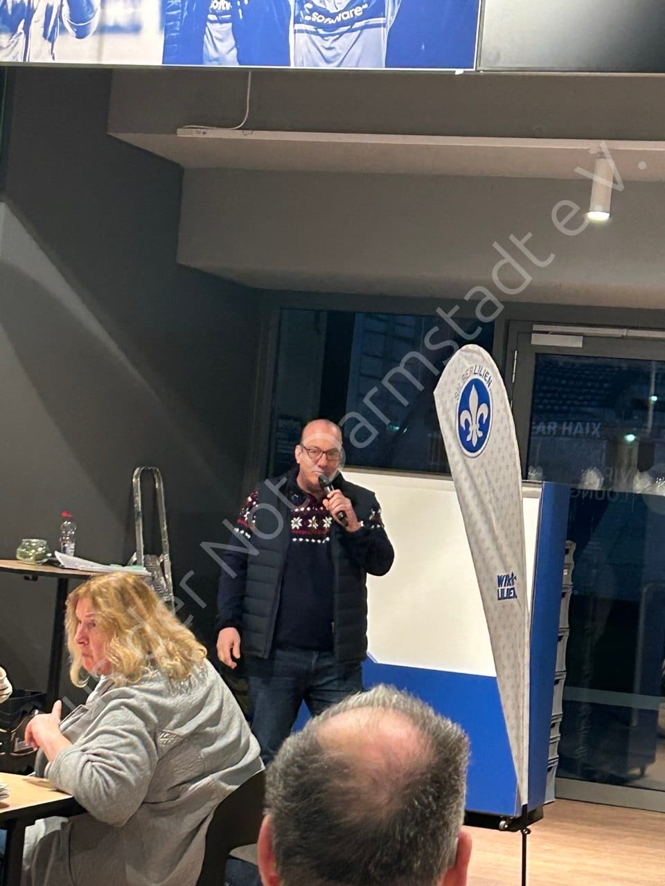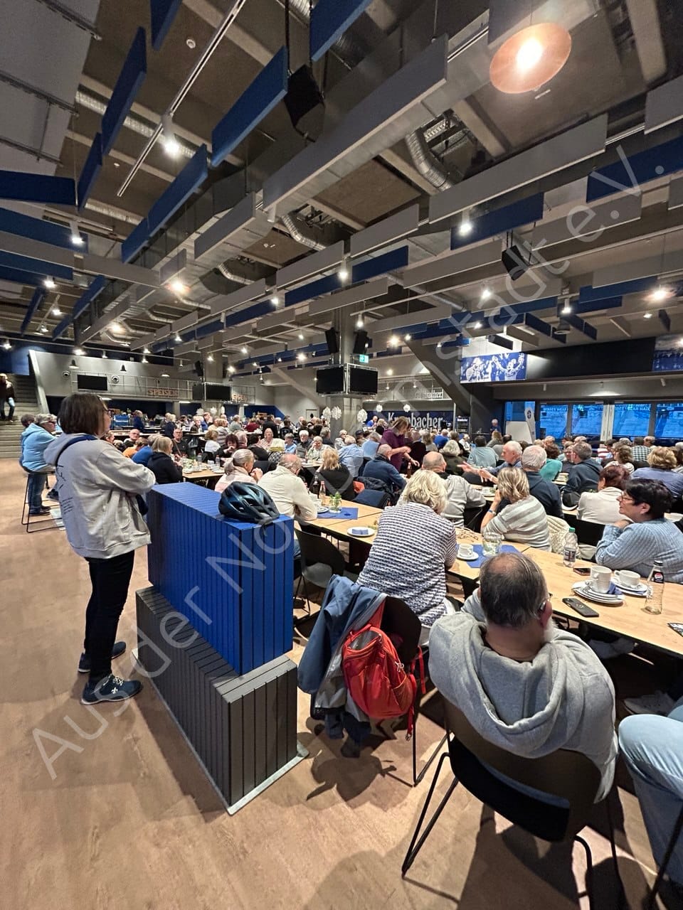 Eigentlich dachte ich, wir treffen uns wie im letzten Jahr im kleinen Kreis mit etwa 15 Frauen. Ich wusste ja nicht, dass ich mich besser vorher umgezogen hätte! Ich war nämlich direkt vorher in Darmstadt unterwegs gewesen, um Essen an Obdachlose zu verteilen. Als ich dann in der VIP-Lounge der Haupttribüne ankam, dachte ich nur: „Oh oh, Überraschung!“ 😅 Diesmal waren es nämlich nicht 15 strickende Frauen, sondern rund 170 Silberlilien bei ihrer großen Adventsfeier. Der Anblick war toll – die Lounge war voll besetzt und alles war wunderschön festlich dekoriert.